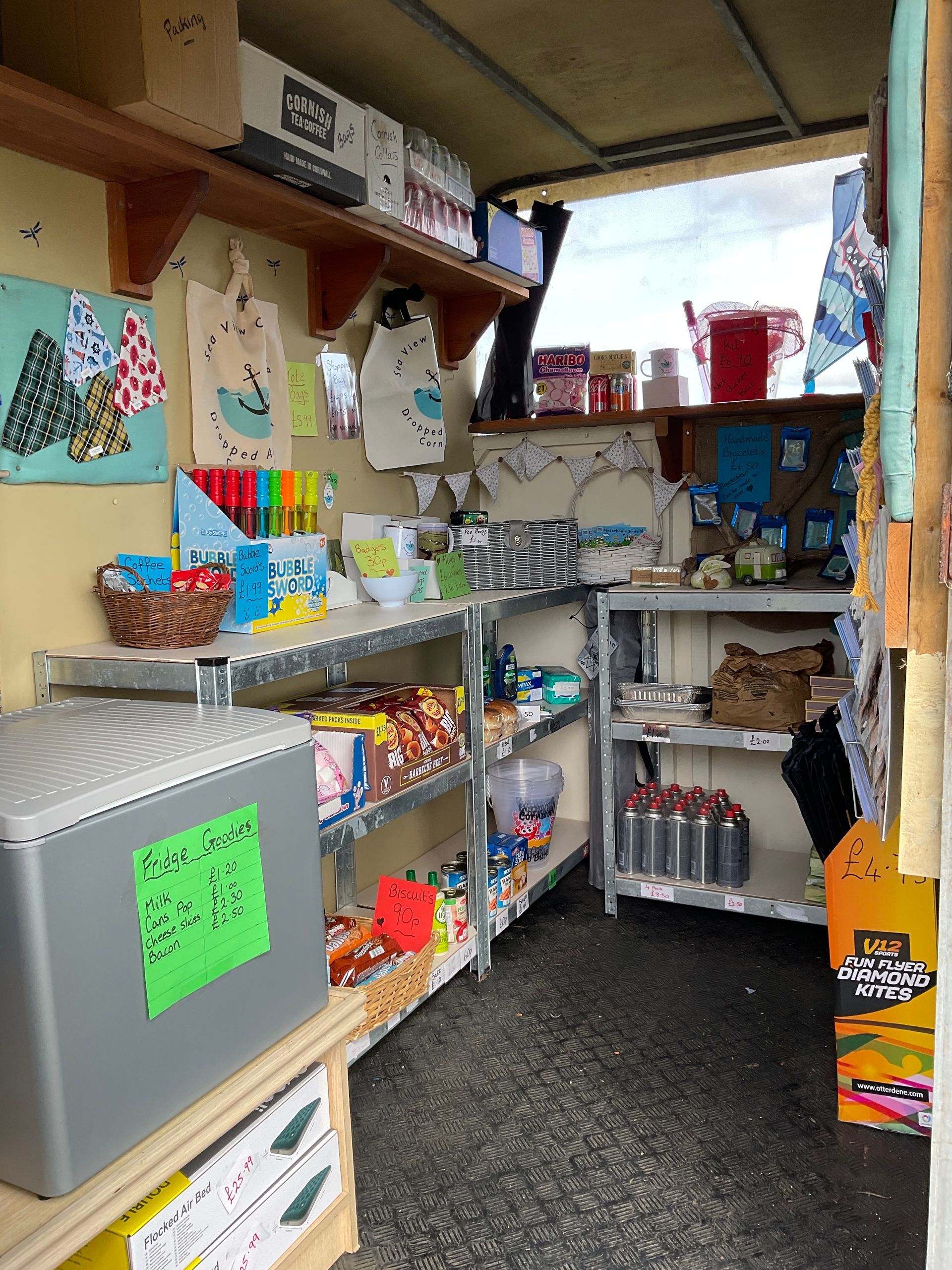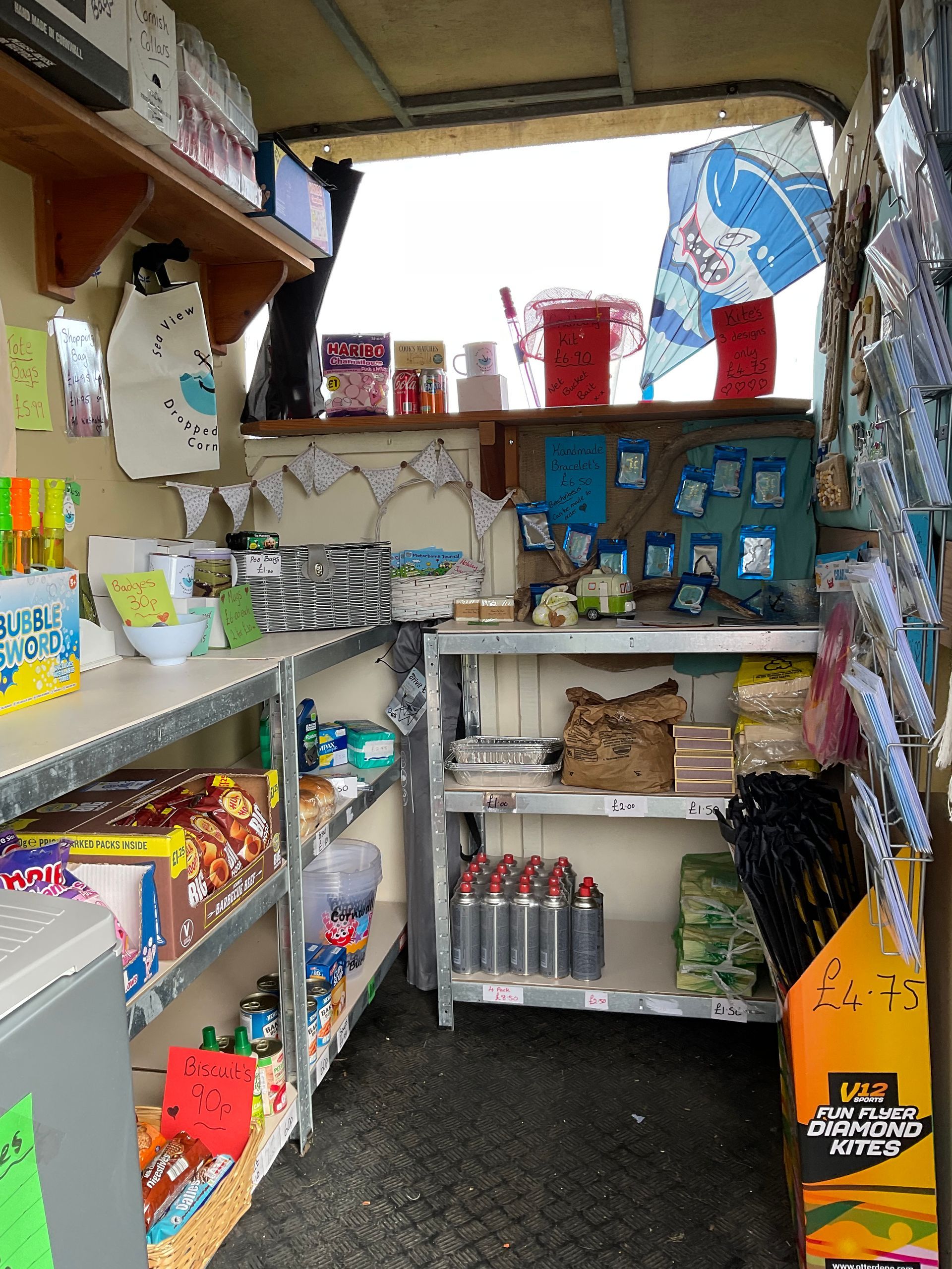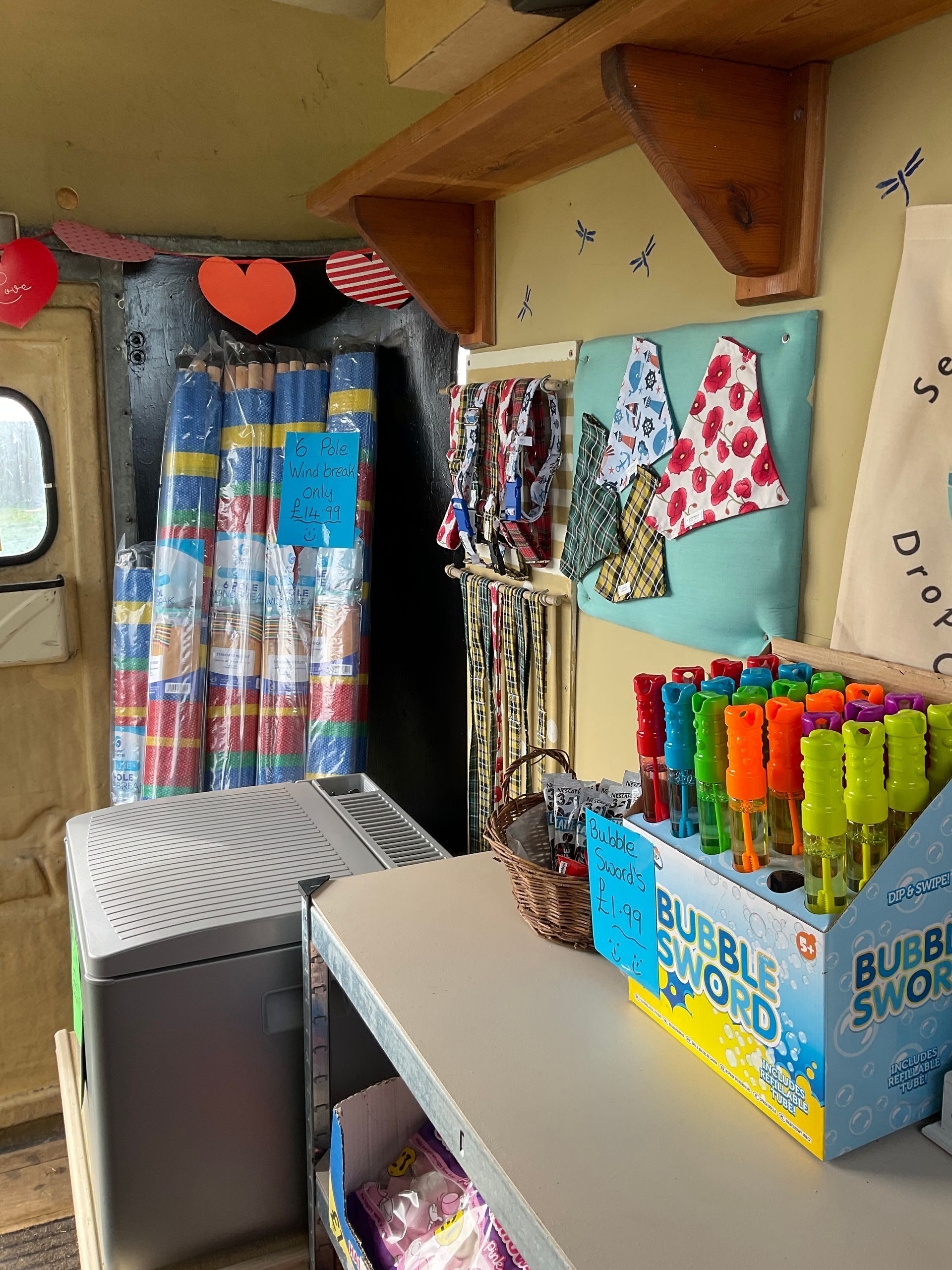We have a small shop on site that sells firewood, kindling, BBQ coal, chocolate, marshmallows, local crafts, Dropped Anchor merchandise and some essential camping items, we also have a small fridge selling milk, bacon, cheese and cold cans of pop