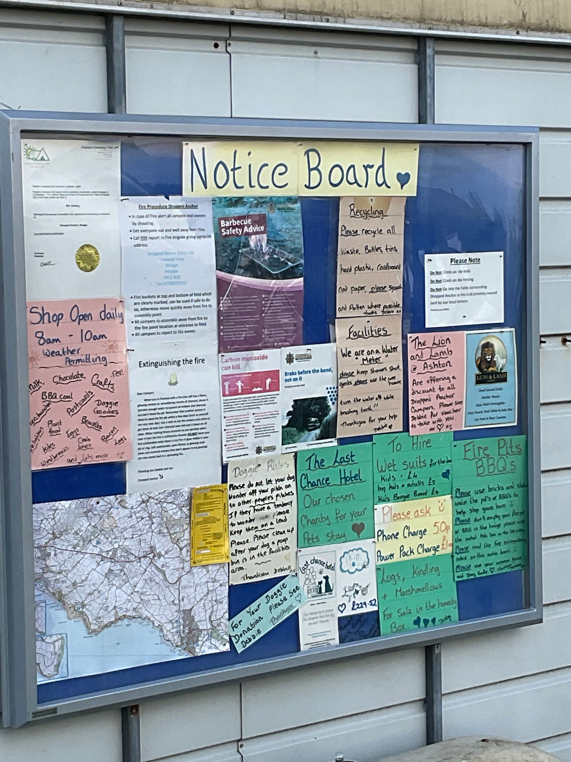 The horse box shop also has a notice board on one side with all kinds of information and on the back is a welcome board and site plan.