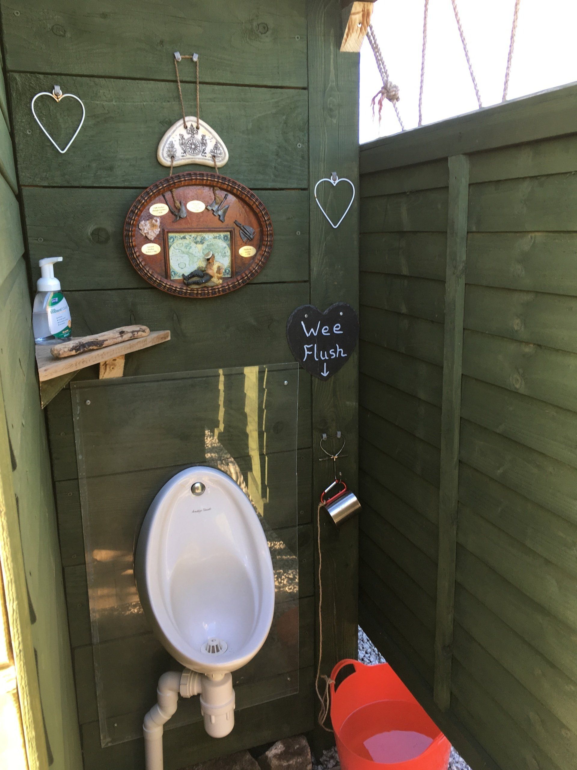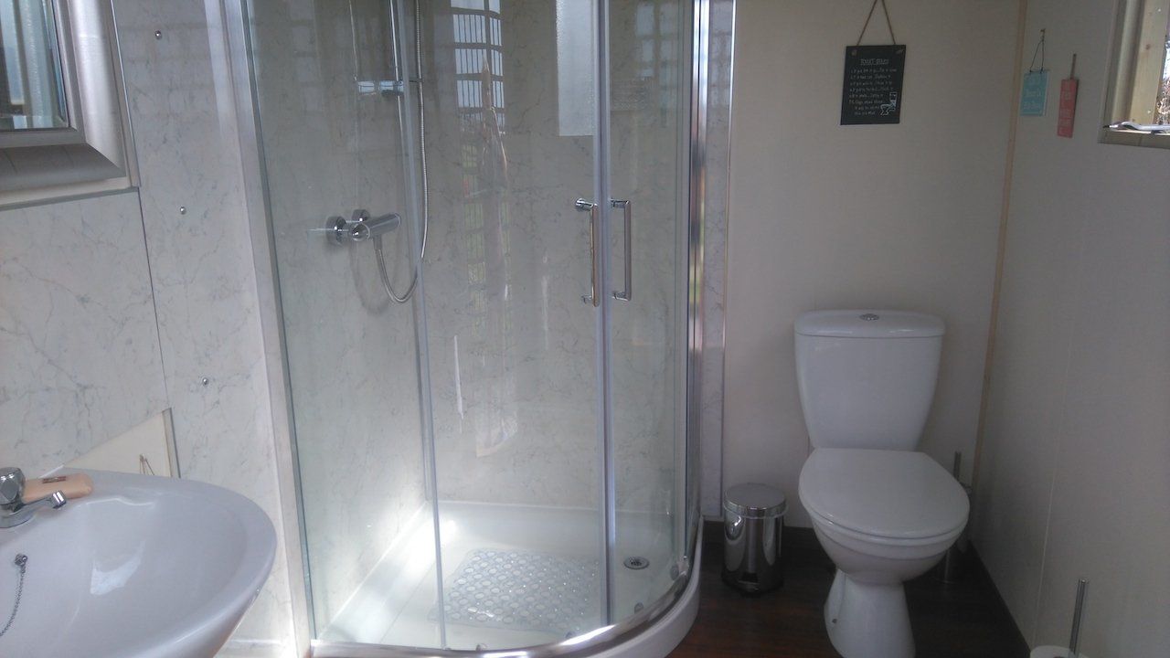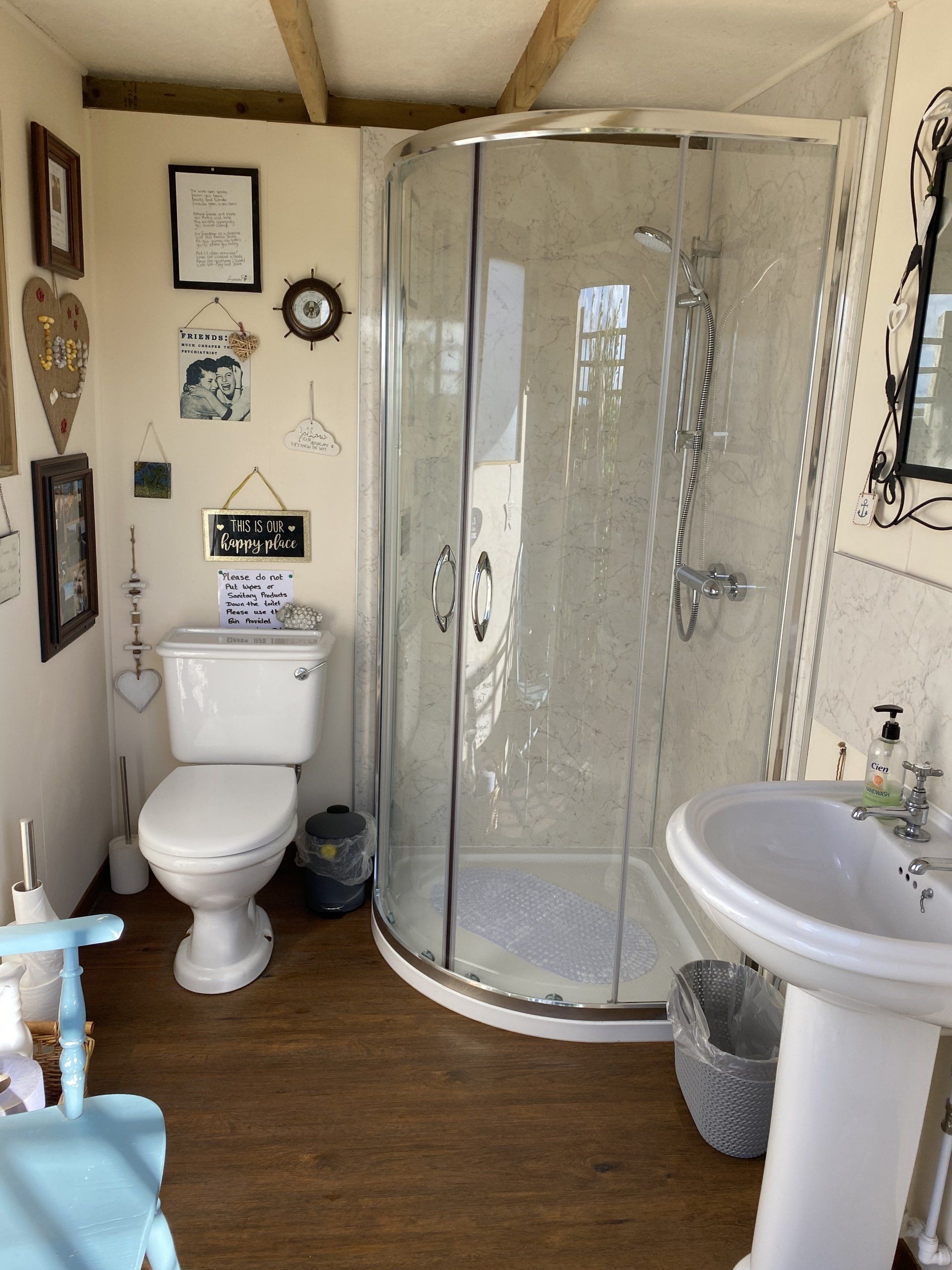 We have a quirky shepherds hut with 2 flushing toilets, 2 spacious shower and toilet rooms both with a corner cubicle offering a free hot shower a gentlemen’s urinals and a hot water dish wash area.