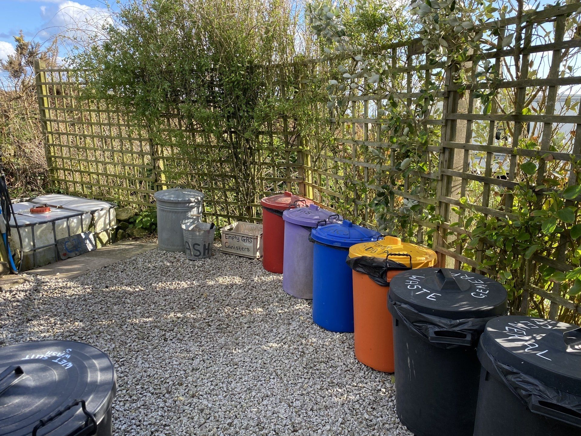 We have several bins which are all clearly labelled for recycling, Glass, hard plastic, cardboard, tins and general waste.